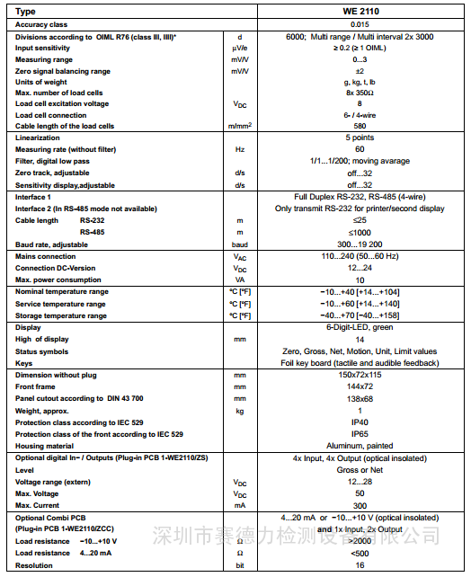 WE2110可以在满量程范围内,输出范围可在 0.2 到 3.0 mV/V 之间调整,用于贸易秤,在单量程模式下其精度为 6000 d, 在双量程下为 2 x 3000 分度,WE2110 是一款高精度数字称重仪表,采用*新的 Sigma-Delta A/D 转换器, 具有极高的测量精度和速度. 精度等级*大到100,000 d ,速度达到 60 次测量/秒。