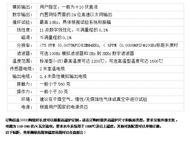 7650A型引伸计通过刚性支架安装到主机上,侧面安装使引伸计与试样接触。引伸计标距可在接触到试样之前自动设定,这样允许达到试验温度后再将引伸计接触到试样上。部件经过特别设计能够提供高精度、高分辨率的测量,也能在尽可能高的频率下完成高温疲劳试验。采用电容传感器来现实低操作力、采用包括与可编程电子过滤和多点线性化来改进性能和精度。整体设计*小化,在许多情况下几乎消除了常见的实验室环境振动对试验结果的任何影响。此水冷引伸计配备铝棒用于1200℃试验,可选配硅碳棒用于1600℃高温试验。