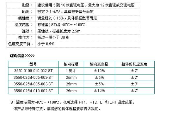 详细信息| 询价留言品牌:美国EPSILON 型号:3550 加工定制:否 外形尺寸:- mm 重量:- ㎏ 产品用途:- 测量范围:- 重量:- ㎏ 产品用途:- 3550 轴向扭转引伸计在轴向/扭转试验机上同时测量轴向和扭转应变 •标距:10-25mm •测量范围:轴向5%和10%,*大2.5°扭转角 •温度范围:-270℃~+200℃ •主要特点:轴向扭转