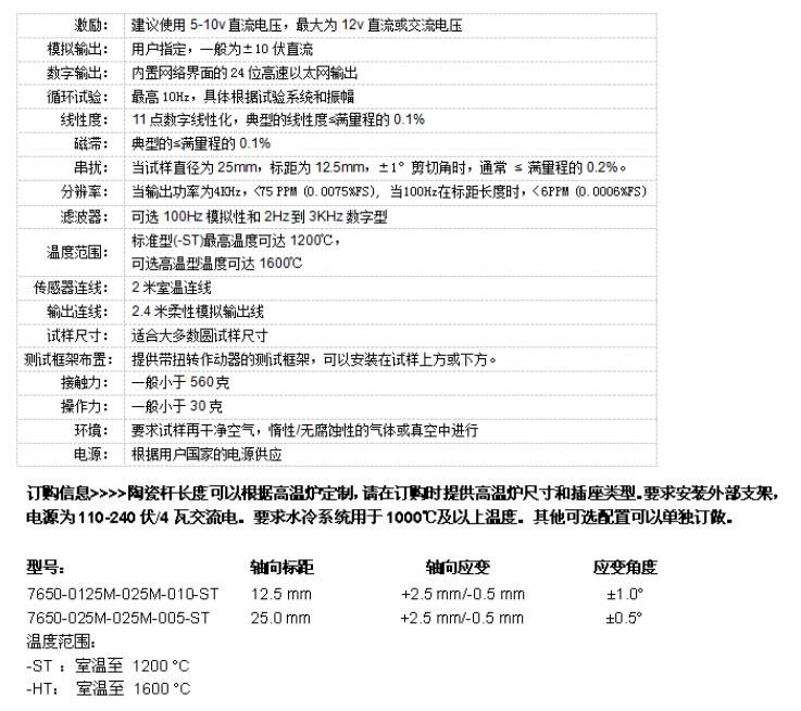 7650型引伸计主要用在圆试样上测试双轴向试验机同步轴向和扭转载荷的能力。所有的型号都能够测量每个轴上的双向位移,可用于完全扭转载荷和应变条件下进行应变控制疲劳测试,*高频率可达10Hz。