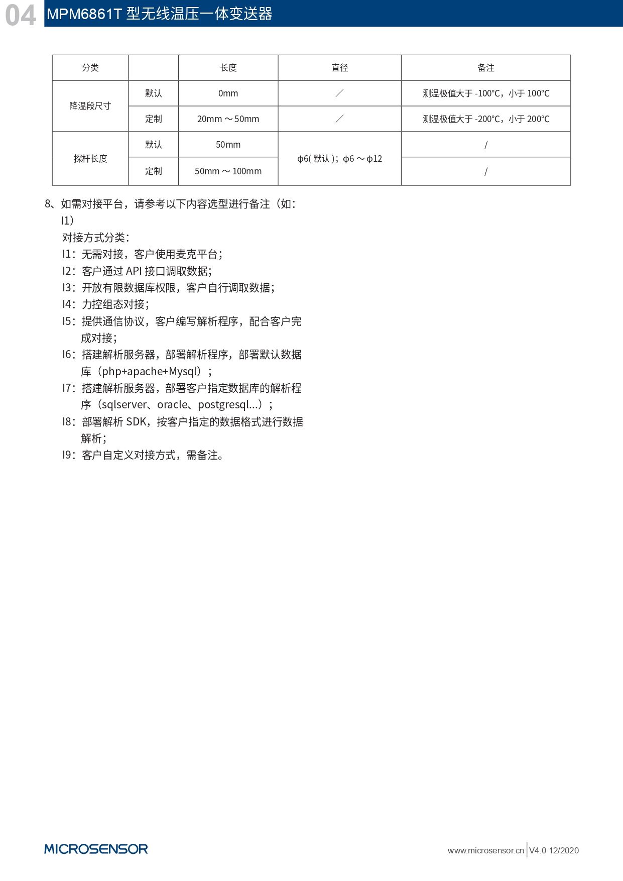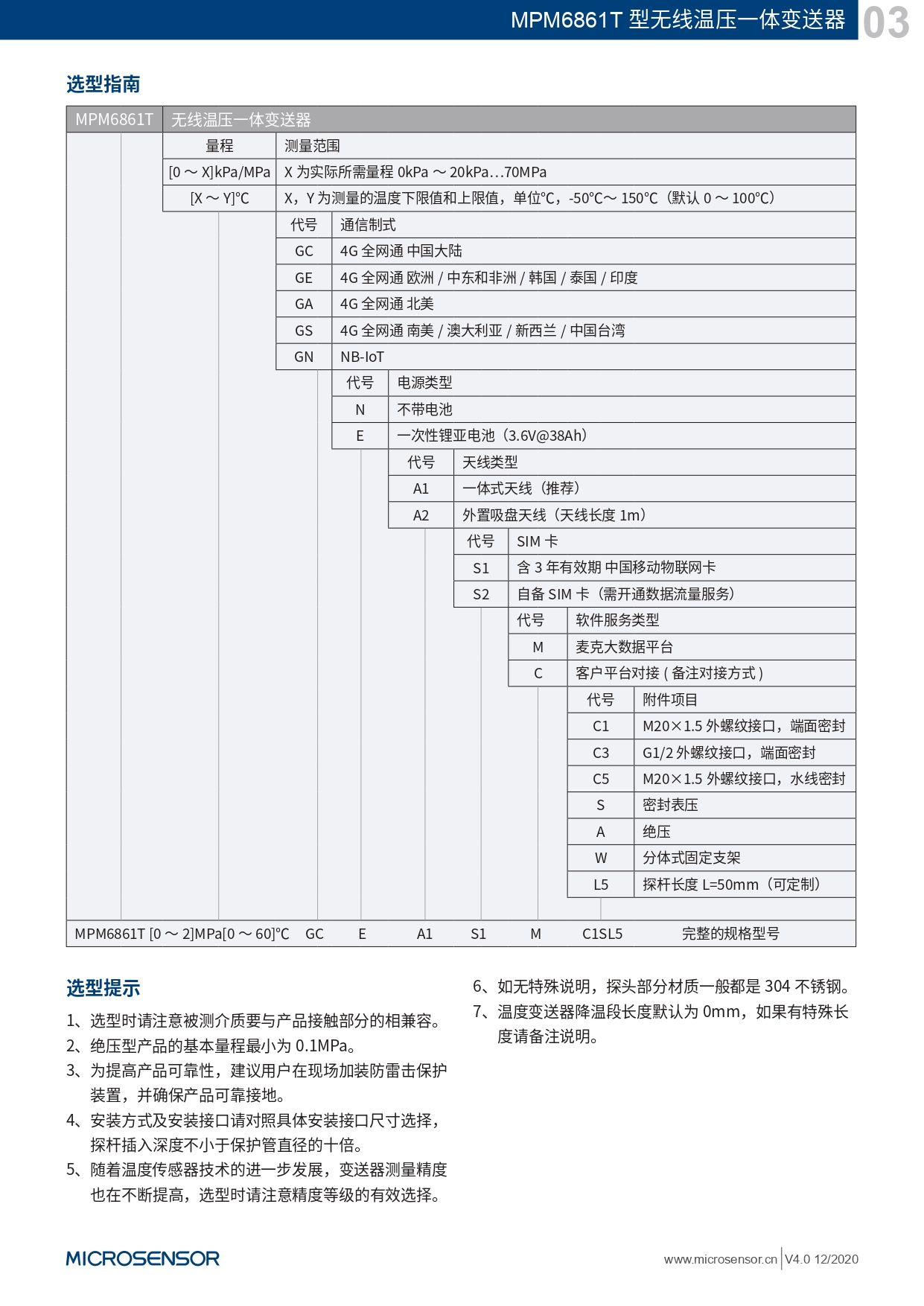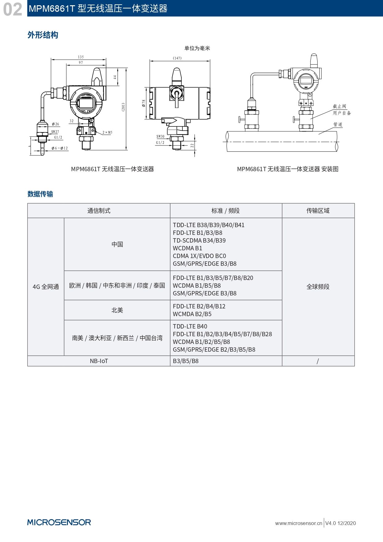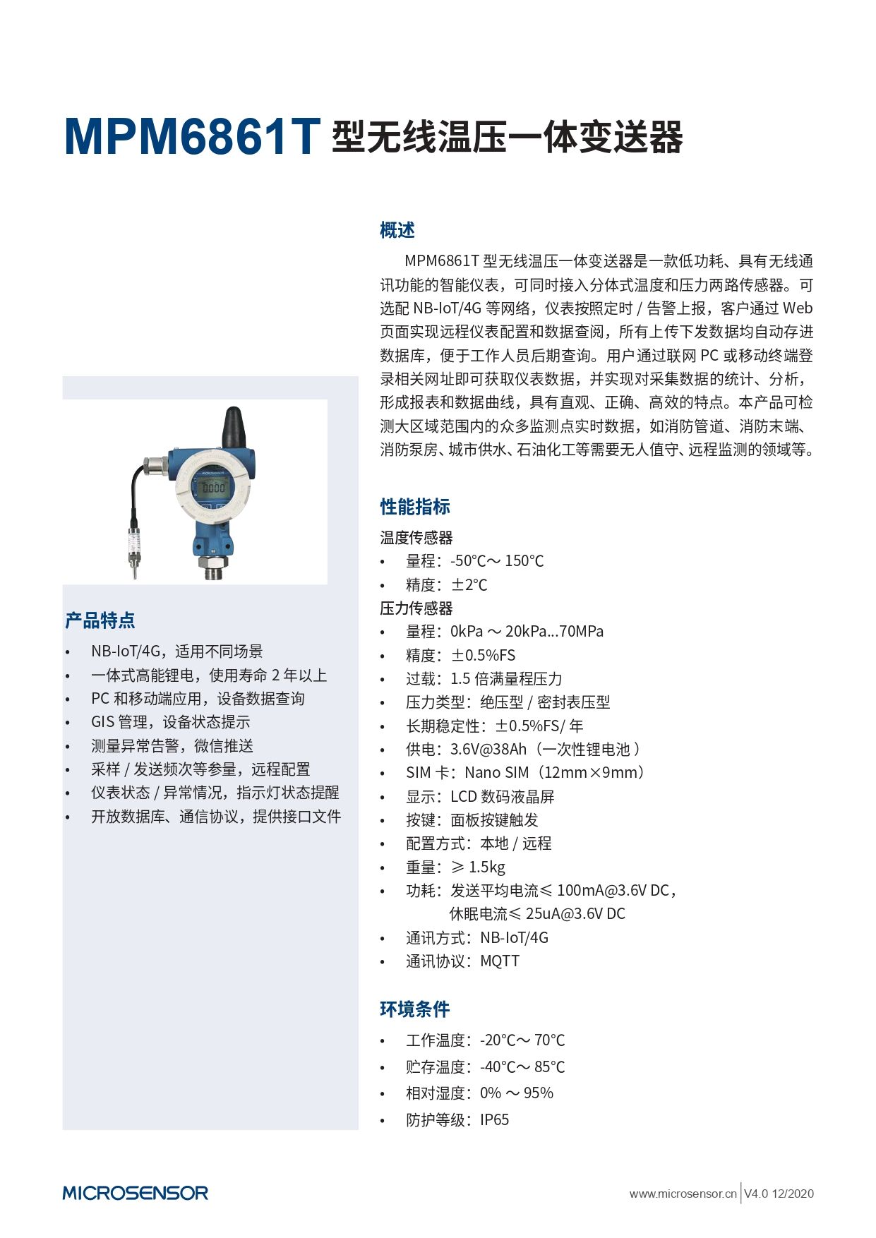 -     microsensor无线温压一体变送器MPM6861T型详细信息| 询价留言品牌:microsensor 型号:MPM6861T型 加工定制:否 制作工艺:集成 输出信号:模拟型 材料:金属 材料物理性质:导体 材料晶体结构:单晶 防护等级:- 线性度:- %F.S 迟滞:- %F.S 重复性:- %F.S 灵敏度:- 分辨率:- 重复性:- %F.S MPM6861T型无线温压一体变送器在线选型支持,联系客服可定制产品NB-IoT/4G,适用不同场景