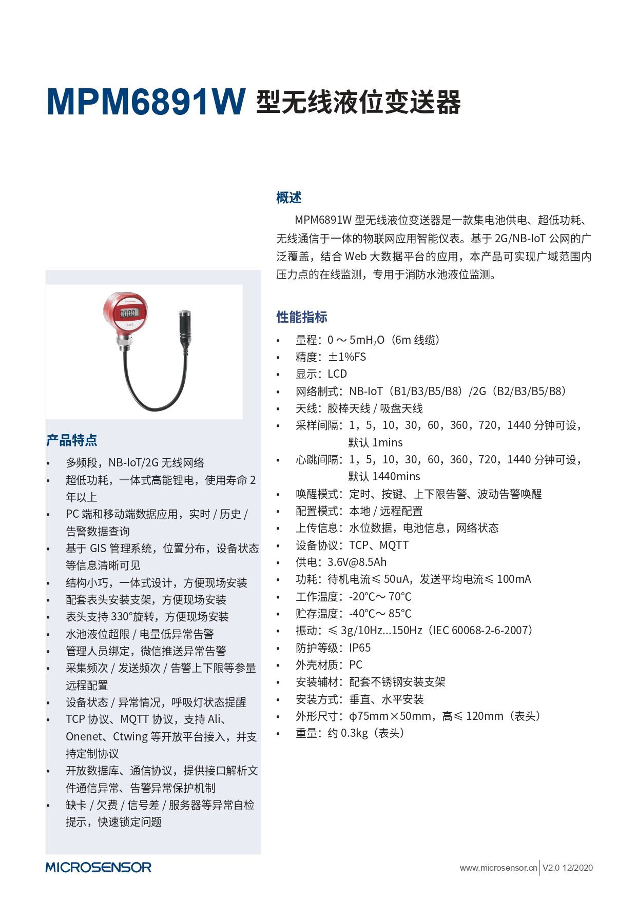 -     microsensor无线液位变送器MPM6861W型详细信息| 询价留言品牌:microsensor 型号:MPM6861W型 加工定制:否 制作工艺:集成 输出信号:模拟型 材料:金属 材料物理性质:导体 材料晶体结构:单晶 防护等级:- 线性度:- %F.S 迟滞:- %F.S 重复性:- %F.S 灵敏度:- 分辨率:- 重复性:- %F.S MPM6861W型无线液位变送器在线选型支持,联系客服可定制产品NB-IoT/4G,适用不同场景