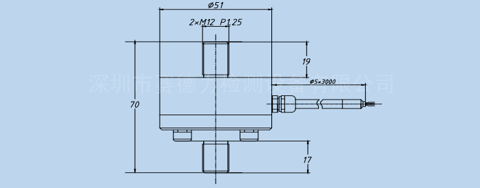 技术参数/Technical Parameters量程 0.5/1/2/5/10 KN 额定输出 2.0±10% mV/V 零点输出 ±2 %R.O. 非线性 0.3 %R.O. 滞后性 0.3 %R.O 重复性 0.3 %R.O 补偿温度范围 -10~+70 ℃ 工作温度范围 -20~+80 ℃ 零点温度漂移 0.01 %R.O./℃ 温度灵敏度飘移 0.01 %R.O./℃ 输入端子间阻抗 470±5 Ω 输出端子间阻抗 350±5 Ω 允许负载 120% %R.O. 极限负载 150% %R.O. 推荐激励电压 5-10 VDC 允许激励电压 15 VDC 绝缘阻抗 ≥5000 MΩ/100VDC 防护等级 IP65 材质 不锈钢 Stainless Steel 电缆尺寸 Φ5x3000 mm 接线方式 输入 Input: [红正 Red(+) 黑负 Black(-)]
