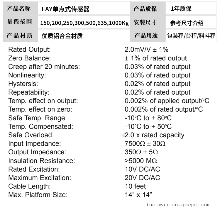 所 在 地: 广东深圳龙岗区 更新日期: 2025-11-07 详细信息| 询价留言品牌:美国传力 加工定制:是 型号:FAY-150Kg,200Kg,250Kg,300Kg,50 制作工艺:集成 输出信号:模拟型 材料:金属 材料物理性质:导体 材料晶体结构:单晶 防护等级:p64 线性度:0.03 %F.S 迟滞:0.03 %F.S 重复性:0.03 %F.S 灵敏度:2mv/v 分辨率:0.0001 重复性:0.03 %F.S -