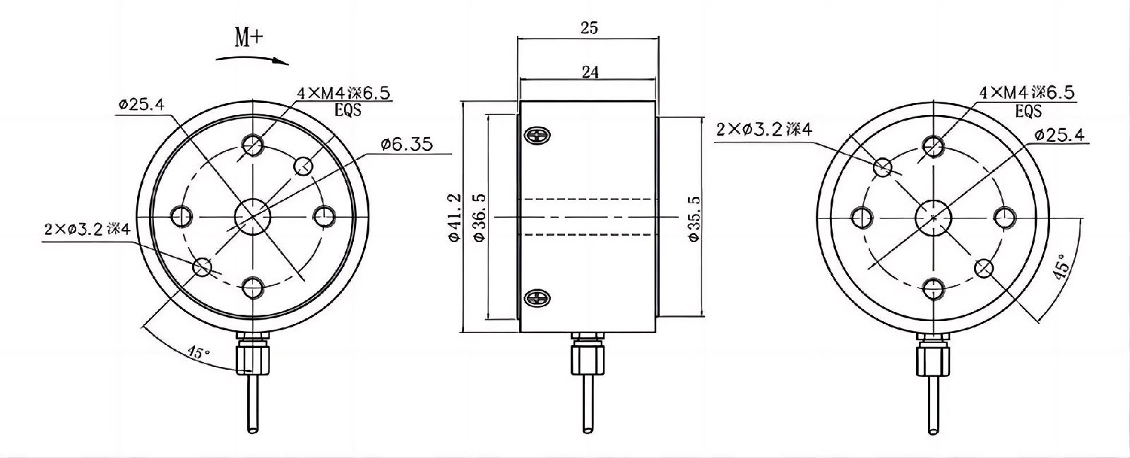 技术参数量程 0.2N.m,0.5N.m,1N.m,5N. m,20N.m,50N.m,100N.m 材质 铝合金/合金钢 非线性 0.2% F.S. 输出灵敏度 1.5~2.0mV/V 使用电压力 5-10VDC *大补偿电压 10VDC 防护等级 IP64 温度补偿范围 - 10 ~ 40 ºC 滞后 0.2% F.S. 工作温度 范围 - 20 ~ 80 ºC 重复性 0.2% F.S. 绝缘电阻 ≥5000MΩ/100VDC 输入阻抗 380 ± 30 Ω 输出阻抗 350 ± 5 Ω 蠕变 (30分钟) 0.2% F.S. 温度灵敏度漂移 0.2% F.S. / 10ºC 零点输出 ± 2% F.S. 零点温度漂移 0.2% F.S. / 10ºC 安全超载 150% 极限超载 200% 电缆线尺寸 ∅3x4m 使用寿命 满量程100万次以上 电缆线连接方式 Ex + : 红 Ex - : 黑