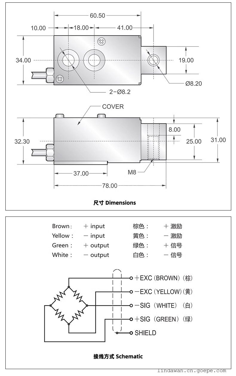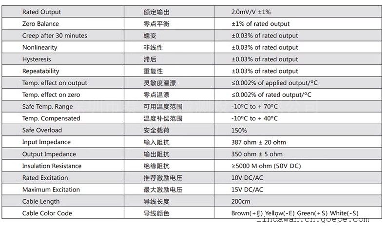 ●Rated Output 额定输出 2.0mV/V ±0.1% Zero Balance 零点平衡 ±1% of rated output Creep after 30 minutes 蠕变 ±0.03% of rated output Nonlinearity 非线性 ±0.03% of rated output Hysteresis 滞后 ±0.03% of rated output Repeatability 重复性 ±0.03% of rated output Temp. effect on output 灵敏度温漂 ≤0.002% of applied output/ºC Temp. effect on zero 零点温漂 ≤0.002% of rated output/ºC Safe Temp. Range 可用温度范围 -10ºC to + 70ºC Temp. Compensated 温度补偿范围 -10ºC to + 40ºC Safe Overload 安全载荷 150% Input Impedance 输入阻抗 387 ohm ± 20 ohm Output Impedance 输出阻抗 350 ohm ± 5 ohm Insulation Resistance 绝缘阻抗 ≥5000 M ohm (50V DC) Rated Excitation 推荐激励电压 10V DC/AC Maximum Excitation *大激励电压 15V DC/AC Cable Length 导线长度 200cm Cable Color Code 导线颜色 Red(+E) Black(-E) Green(+S) White(-S) -