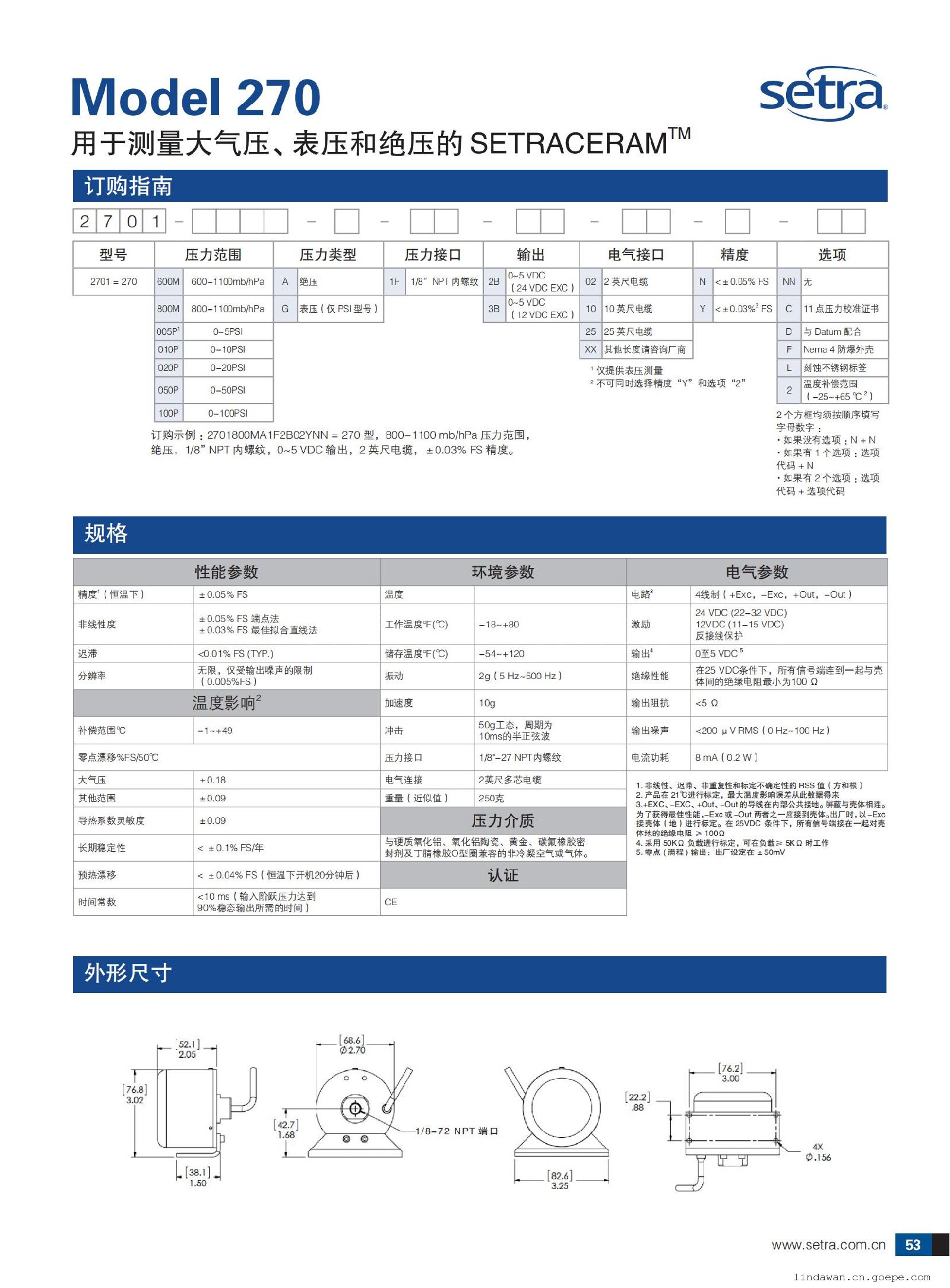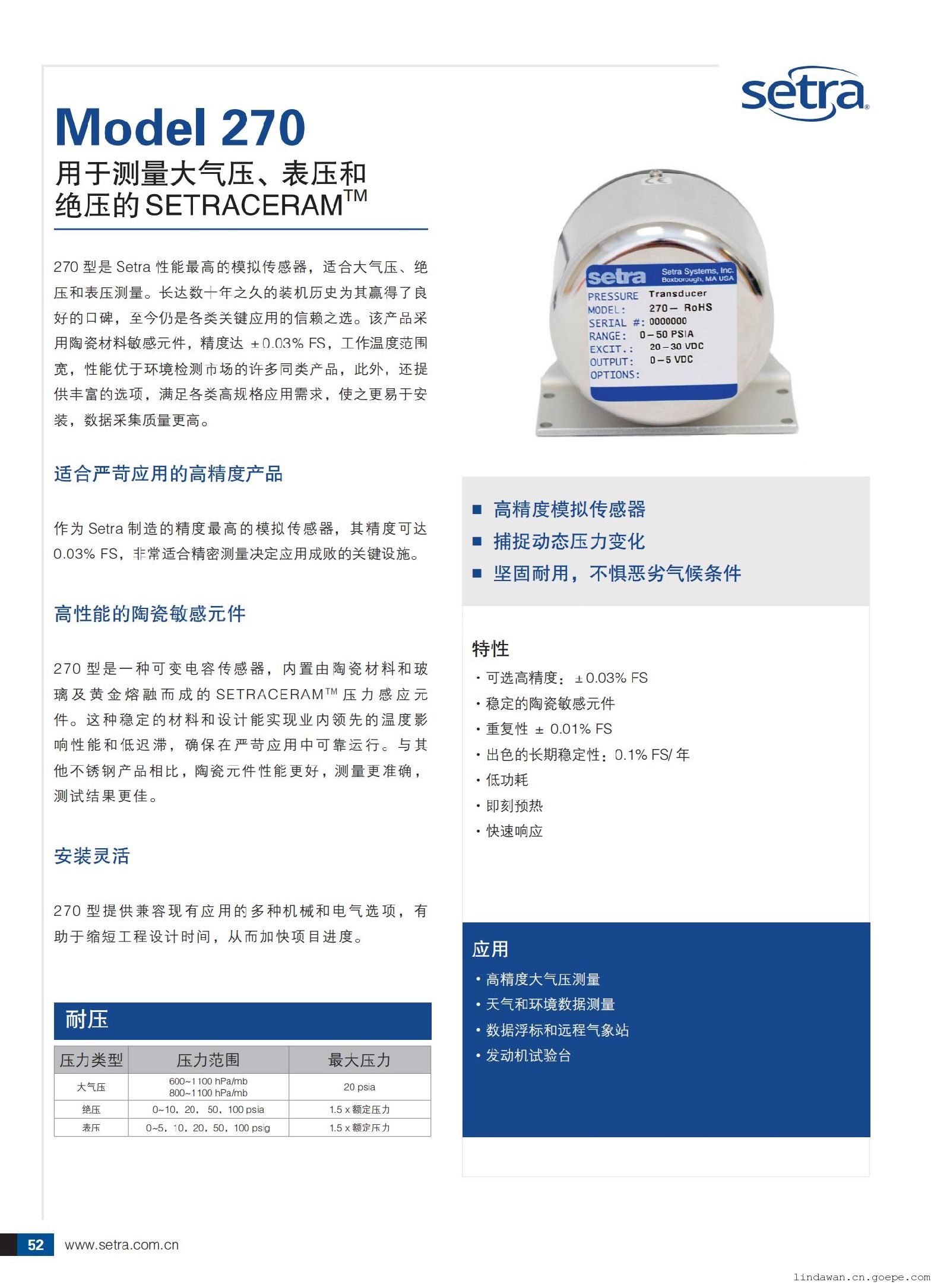 SETRA CERAMTM 敏感元件与西特(Setra) 独特的检测电路的完美结合赋予了Model270 很高的性能,高质量的输出信号、优良的稳定性和精度及快速的动态响应,使得Model 270 成为气象、环境监测、航空航天、军事及科学研究等众多领域高精度大气压/ 中压力测量的理想产品。